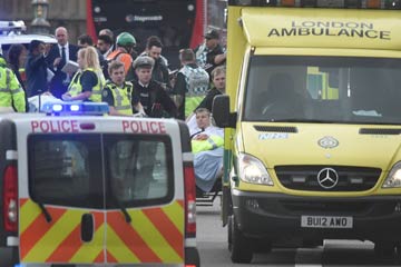 3月22日,在英国伦敦的议会大厦外,救援人员将伤者运送到救护车上。 |