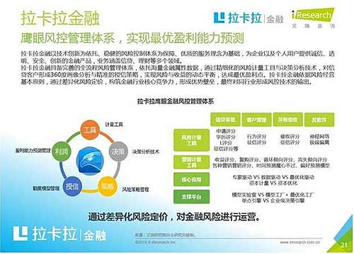 面对机遇与挑战并存的行业现状,拉卡拉金融打造出了成熟的风控样板。报告指出,拉卡拉金融打造的“鹰眼”风控管理体系,依托积累的海量金融属性数据,通过精细化的风险计量工具与决策分析技术,进行完善的全流程风险管理,从而最终实现最优盈利能力预测。