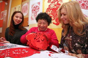 烟台剪纸技艺传承人朱曼华正在教外国友人剪纸 唐克/摄 |