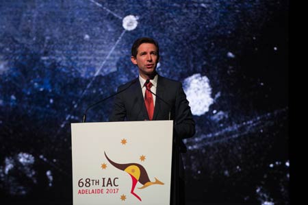 9月25日,在澳大利亚阿德莱德会展中心,澳大利亚联邦教育和培训部长西蒙·伯明翰在第68届国际宇航大会开幕式上讲话。
