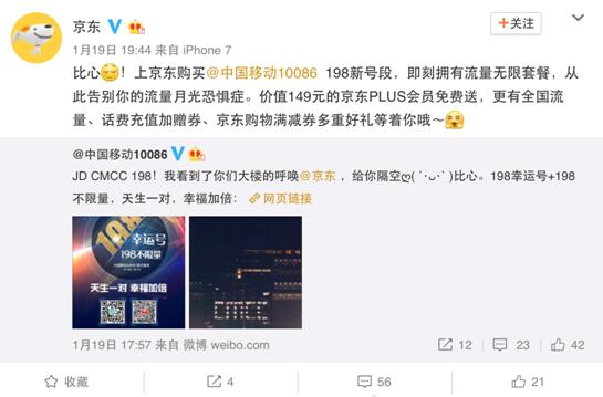 当天晚上,中国移动官方微博发布了一张京东总部大楼亮起了“JD CMCC 198”字样灯光的照片,同时发布了双方的联合宣传海报并与京东官方微博隔空互动,将当天198新号段的线上首发活动推向高潮。