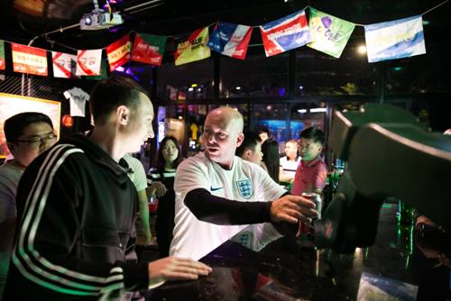 进入欢聚吧内部,足球、啤酒、拉拉宝贝、音乐、游戏,一群球迷正举起手中的青岛啤酒,畅聊当日的比赛盛况,俄罗斯足球宝贝穿插忙碌,与球迷互动合影。