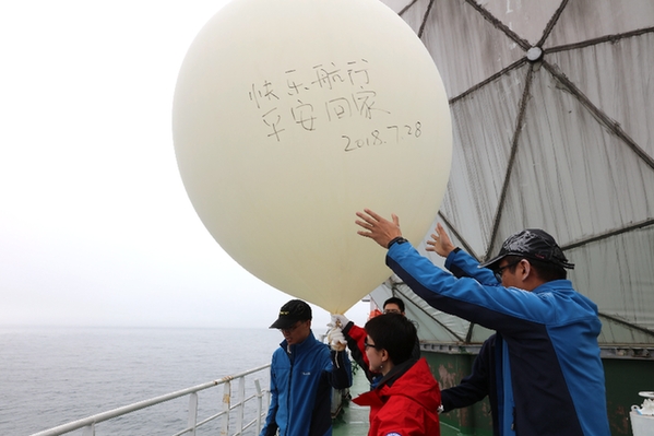 7月28日,“雪龙”号上的中国第九次北极科学考察队成员在白令海公海区域释放探空气球,用于观测北极地区气象要素变化特征。