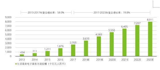 德勤中国预测,2023年生活服务市场的整体规模也将达到33万亿元,接近2017年水平的一倍。
