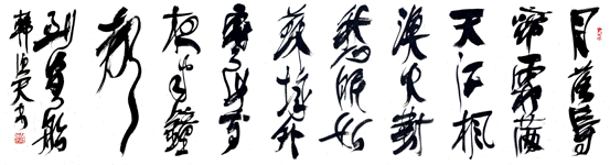 韩渔天:艺术博大精深,包罗万象,且相互影响,舞蹈、音乐也能促使书法创作进入更高境界。书法无止境,作为一种探索,要汲取的营养不是单一的,应该具有各方面的素质;艺术无止境,应该学的很深,不光是习字,还得寻找一种乐趣,这点非常重要。不能只想着成名成家,我追求的是一种自我愉快的心境,而不在乎金钱物质,一般地搞艺术,能够达到这样心态的人不多。如果光想着搞钱,艺术水准将会下降,反之,如果你看淡名利,你的作品水平自然提高,质量上来了,作为一个艺术家,你所追求的是真正的艺术,真正的自我。艺术的成长需要全身心的投入进去,我的整个投入就是写字画画。