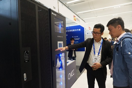 10月25日,工作人员(左)在2018中国计算机大会上向参观者介绍国产新型智能数据中心的功能。