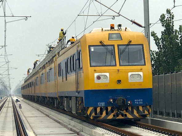10日上午,随着雄安动车所最后一架断路器闭合,京雄城际大兴机场至雄安段接触网送电成功,京雄城际全线接触网贯通。作为我国智能高铁的“新标杆”,京雄城际是智能设计、智能建造、智能运维的样板。京雄城际预计2020年底开通运营。届时,从北京到雄安只需1小时左右,京津冀区域路网布局将进一步完善,有助于雄安新区加快产业聚集。图为综合检修列车在工作中(8月26日摄)。