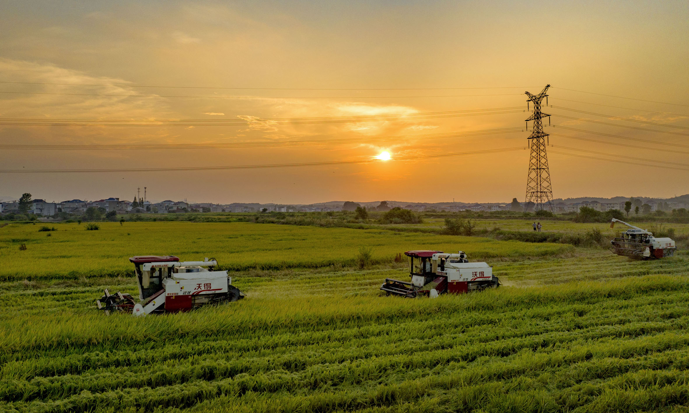 夏日时节,各地农民抓紧农时,田间地头一片繁忙。图为江西省九江市都昌县蔡岭镇杨湾村的农机手驾驶收割机抢收水稻(无人机照片)。