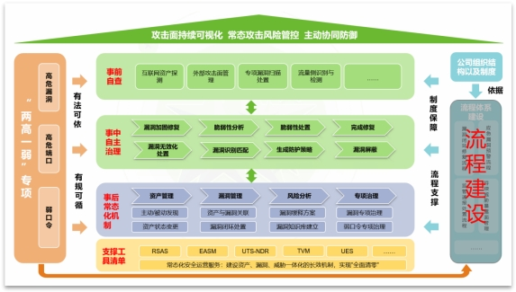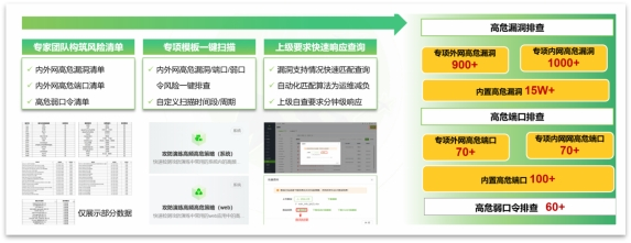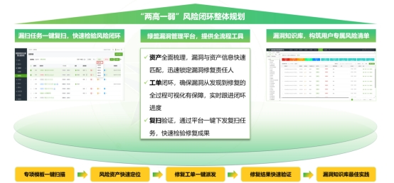 绿盟科技推出“两高一弱”专项解决方案,依托多维度风险主动探测、流量分析被动风险识别、高危漏洞无效化防护、多源风险统一闭环管理等关键技术能力,构建事前自查自检、事中自主治理、事后常态化风险运营的管理和技术体系,建立资产、风险、威胁一体化管理的长效机制。