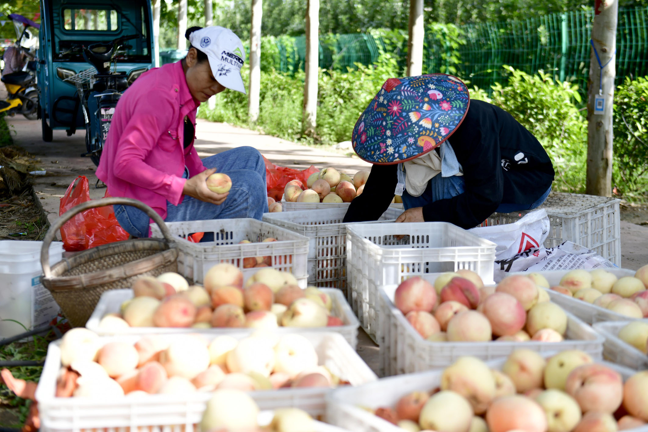 8月10日,在山东省济宁市微山县驩城镇微湖风合作社,村民在分拣桃子。近年来,山东省济宁市微山县驩城镇以农业增效、农民增收为主线,大力发展特色种植、特色养殖和葫芦文创产品,助推乡村振兴。