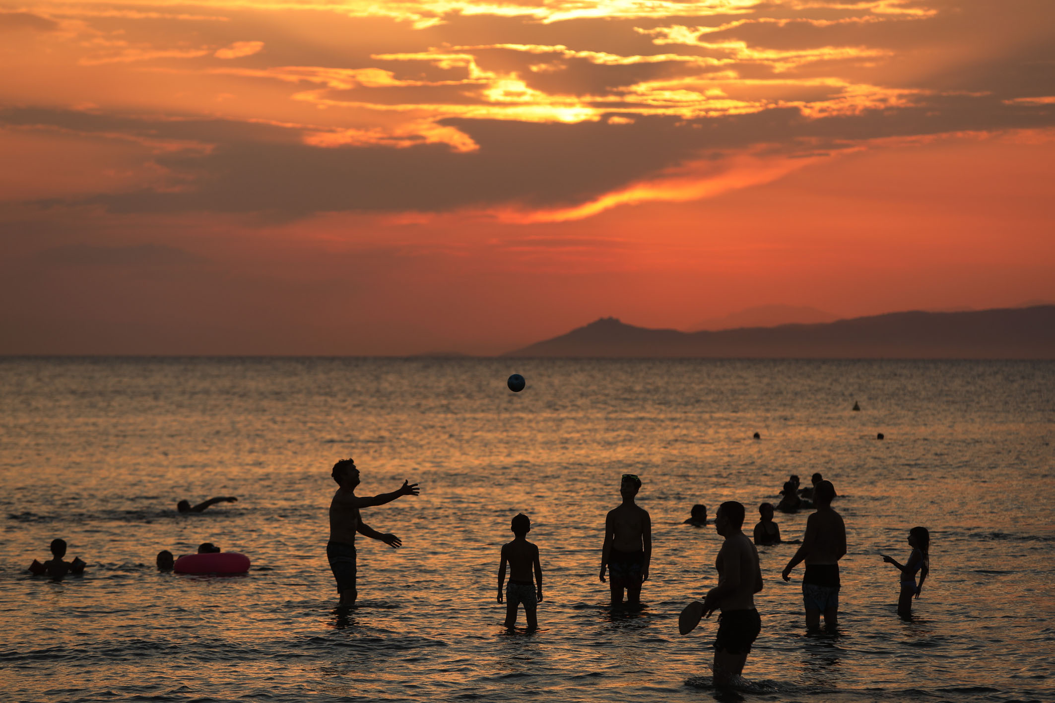 图为人们在希腊雅典南部的卡乌里海滩欣赏日落。