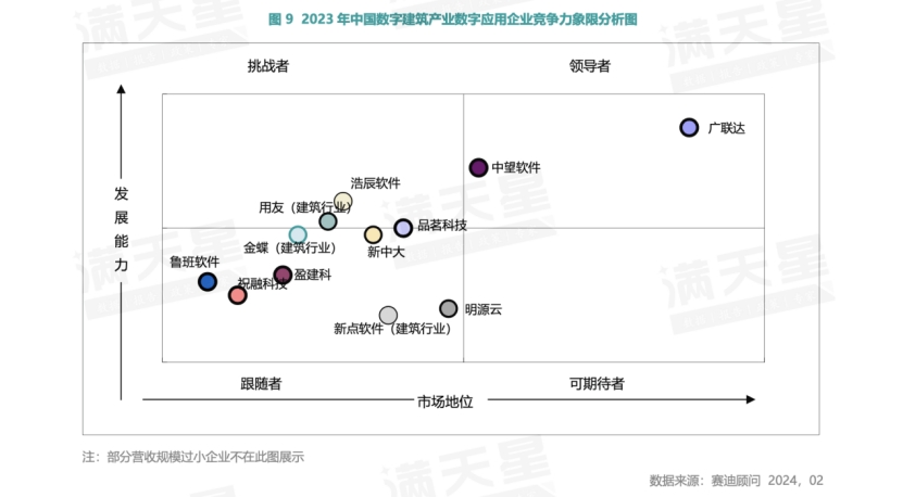 2023年,数字应用场景企业业务发展各有千秋。中国建设工程信息化领域首家A股上市公司广联达,提供建筑全生命周期数字化解决方案,设计、成本、施工等核心业务不断创新,建筑行业 AI大模型AecGPT和建筑行业AI平台重磅发布。广联达还是为数不多的具备建筑行业数字化核心技术自主知识产权的企业,打造“一横一纵一AI”,充分释放数字化技术潜能,构建并筑高核心技术优势,其发展能力和市场地位依然稳健,处于领导者地位。广州中望软件、用友等企业,发展潜力也值得期待。