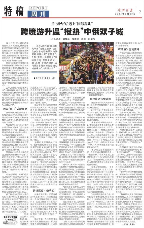 “随着便利交通与旅游政策的刺激,人们对跨国的差异化旅游更加向往,加上避暑游、边境游、跨境游等多种旅游业态叠加,跨境游开始持续火爆。”黑龙江省社会科学院文学研究所文化艺术与产业研究室助理研究员郝帅认为,推动“中俄双子城”跨境游是中俄地方合作的重要举措,不仅促进两个城市的经济发展,更有利于深化中俄两国人文交流。