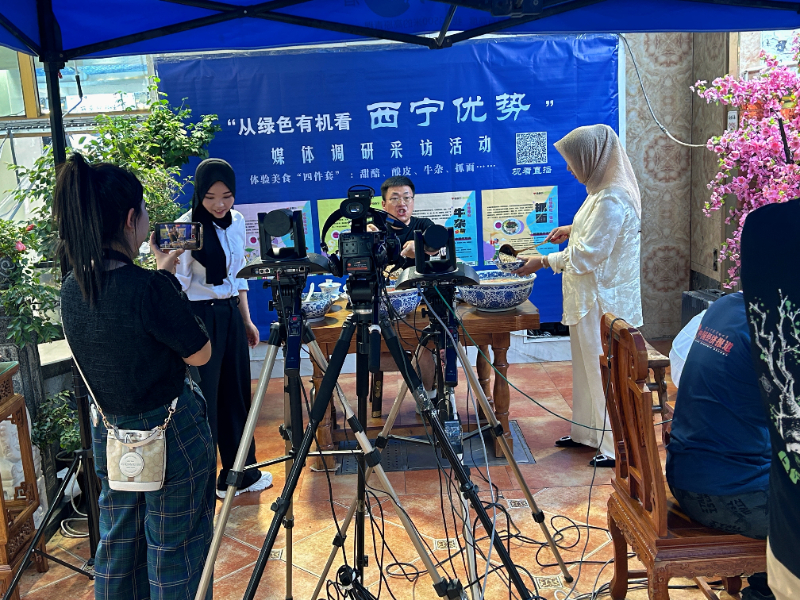 由青海省西宁市商务局主办、新华社新闻信息中心青海中心承办的“从绿色有机看西宁优势”媒体调研采访活动近日在西宁市举行。图为7月18日在马忠食府直播体验美食四件套(甜醅、酿皮、牛杂汤、抓面)活动现场。郑建华 摄