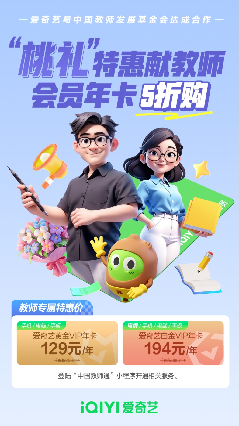 8月26日,中国教师发展基金会在京启动“尊师惠师公益行动”。该活动由教育部等七部委统筹协调,教育部教师工作司指导,在教育部教育管理信息中心支持和爱心企业参与下,通过公益模式为教师做好事、办实事。首批签约的17家企业将从工作学习、影音服务、金融服务、日用家电、交通出行、汽车住房购置等方面为教师提供长期优惠政策。其中,爱奇艺作为网络视听领域的代表平台,将为广大教师提供会员订阅特惠服务:自2024年教师节开始,成功在“中国教师通”小程序平台完成注册认证的各级各类学校在职教师,每个自然年内可以5折优惠价购买爱奇艺黄金VIP会员年卡和爱奇艺白金VIP会员年卡各一次。