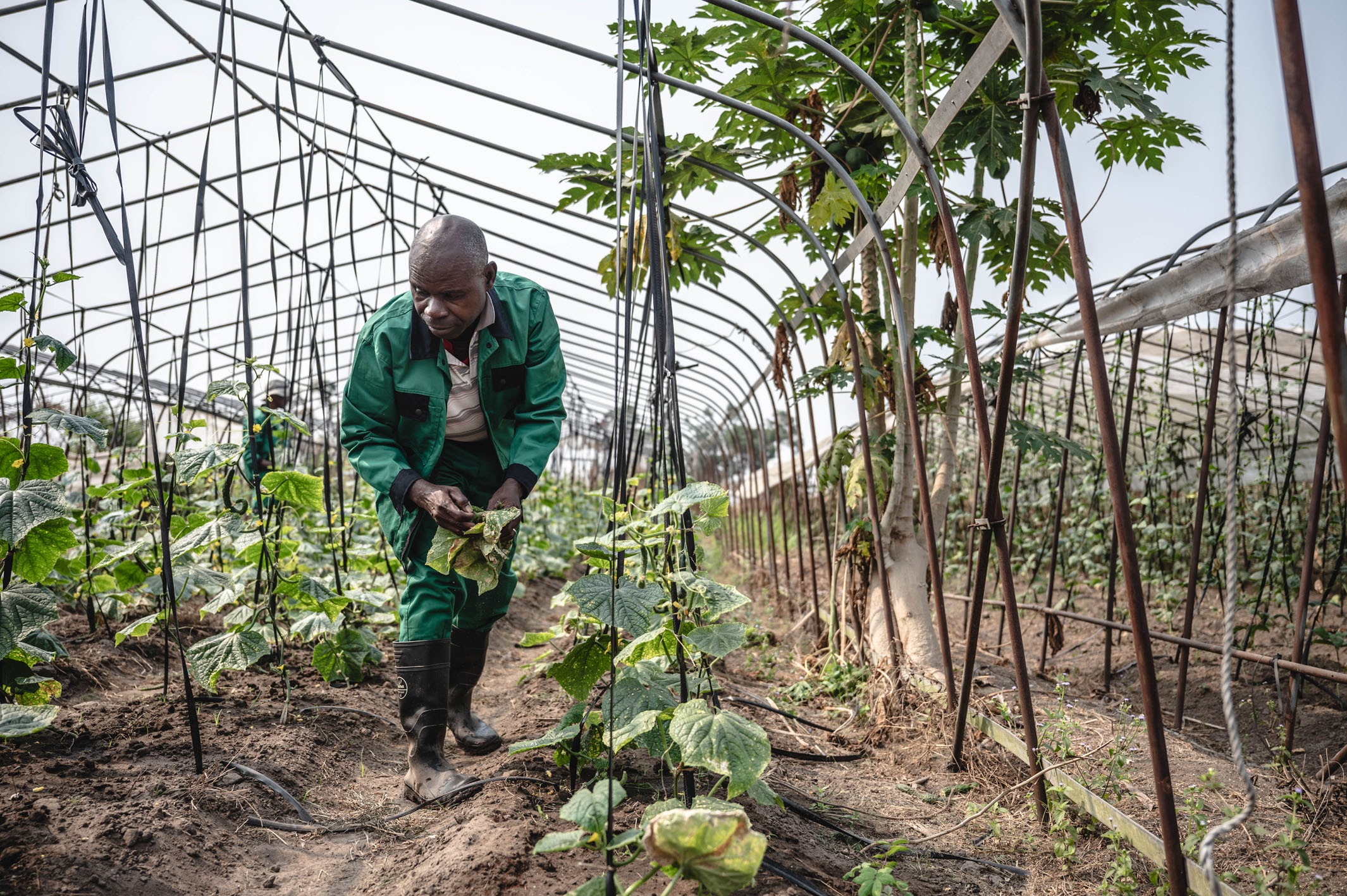 图为在刚果(布)首都布拉柴维尔的中国援刚果(布)农业技术示范中心内,当地员工在大棚内查看黄瓜长势。 新华社记者 王冠森 摄