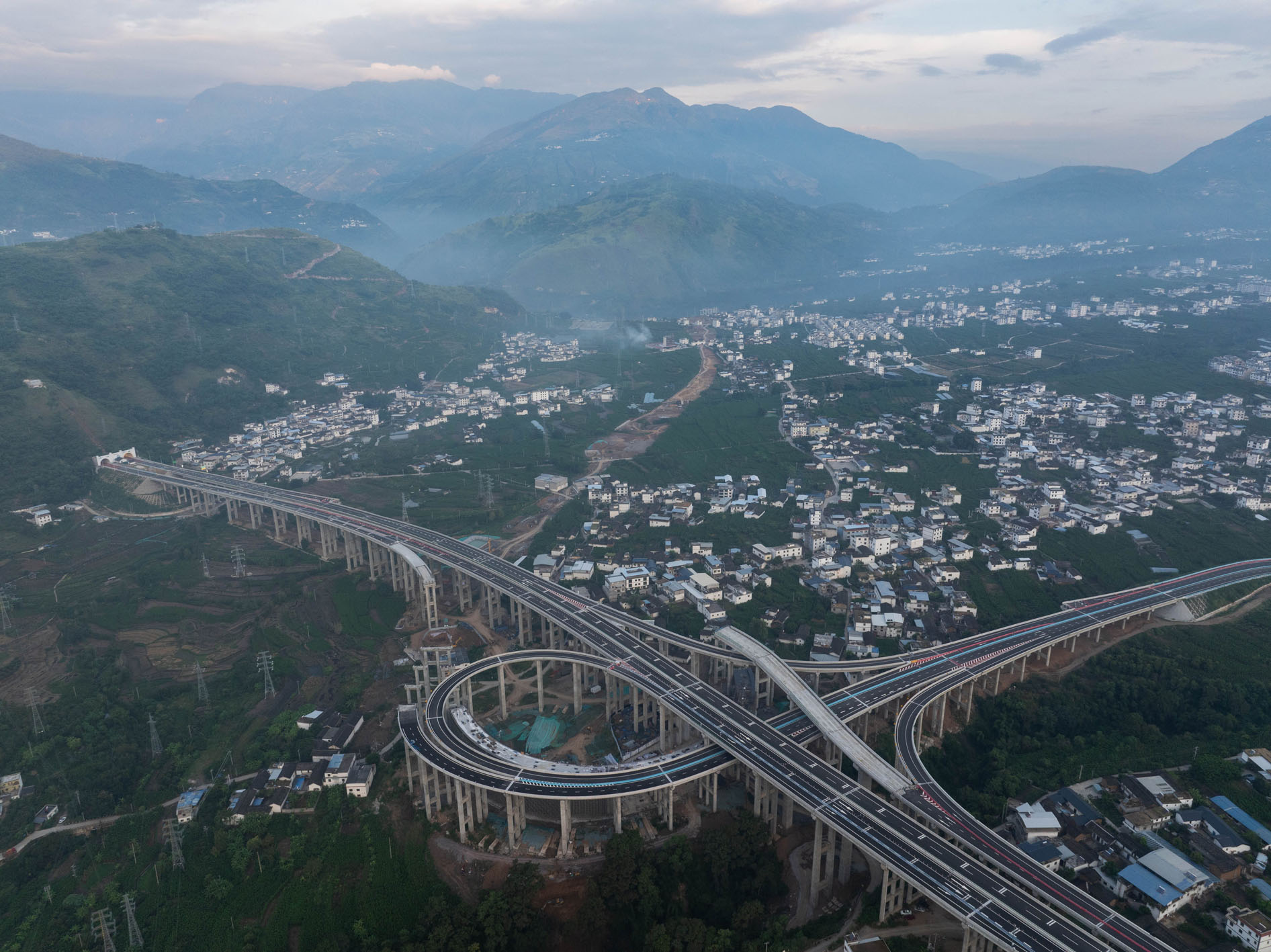 俯瞰在建的宜攀高速宁南互通(9月12日摄,无人机照片)。9月12日,天府新区至邛崃高速公路(全线)、南充至成都高速公路扩容项目(部分路段)、成都至乐山高速公路扩容项目(部分路段)等5条高速公路正式通车,9月13日起陆续向社会开放交通。这标志着四川高速公路总里程突破10000公里,达到10051公里。