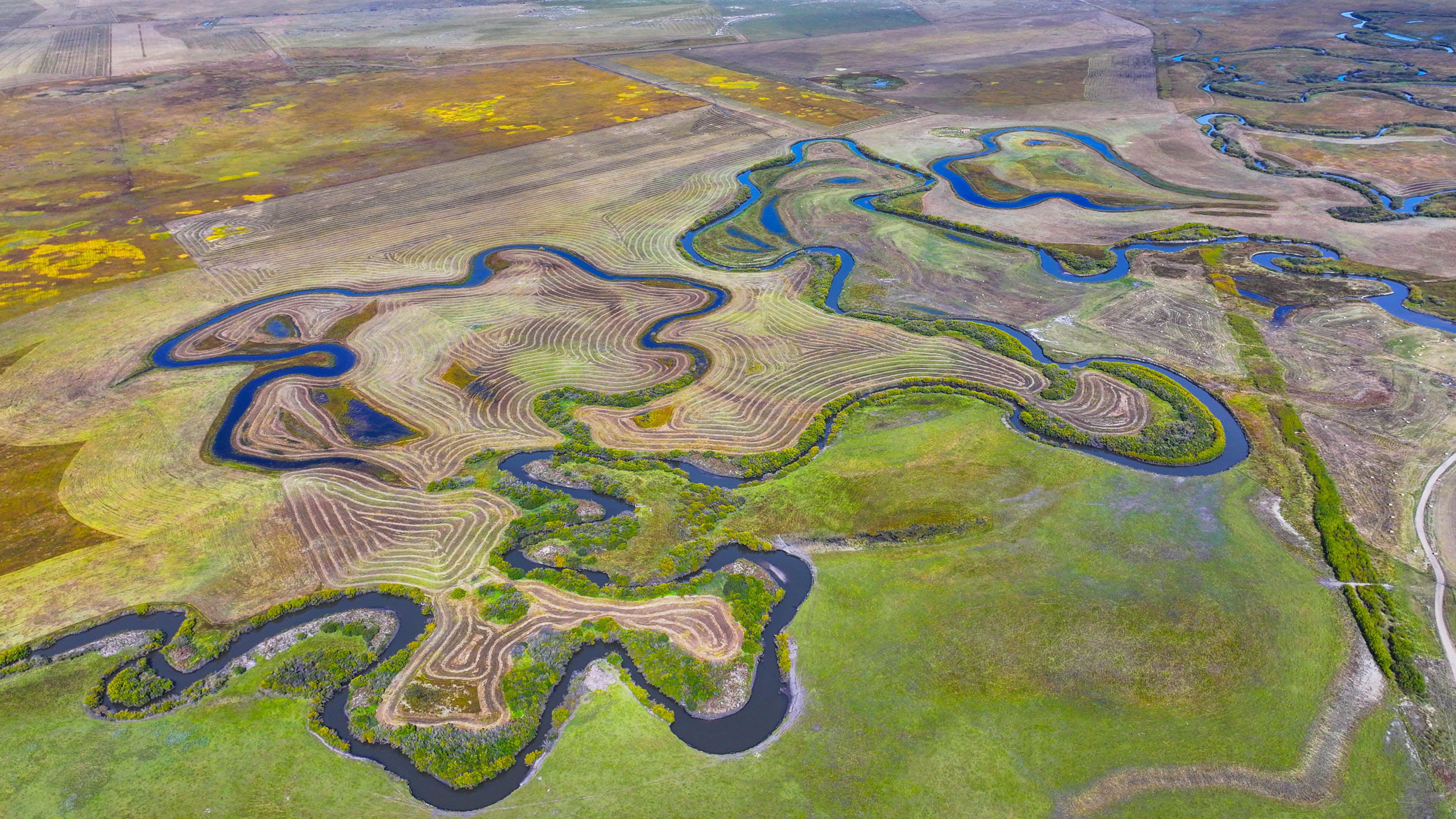 秋日,位于内蒙古锡林郭勒盟东北部的乌拉盖草原色彩斑斓,蔚蓝色的天幕下,河水蜿蜒流淌,草原披上“秋装”。图为9月17日拍摄的乌拉盖草原(无人机照片)。