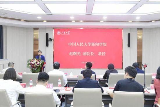 中国人民大学新闻学院副院长、教授、博士生导师、中国人民大学国家治理与舆论生态研究院副院长赵曙光在致辞时分享了中国人民大学国际新闻专业建设的宝贵经验,并表示,专业的发展应以国家顶层设计为基础,要有全球视野。国际新闻与传播专业为国际传播产品提供理论支撑,反过来,国际传播产品也推动了国际新闻与传播专业的建设与发展。山东大学设立国际新闻与传播专业,是顺应时代与国家需要的重要举措。中国人民大学新闻学院愿与山东大学新闻传播学院一起为“讲好中国故事”协同发力,做出新的贡献。