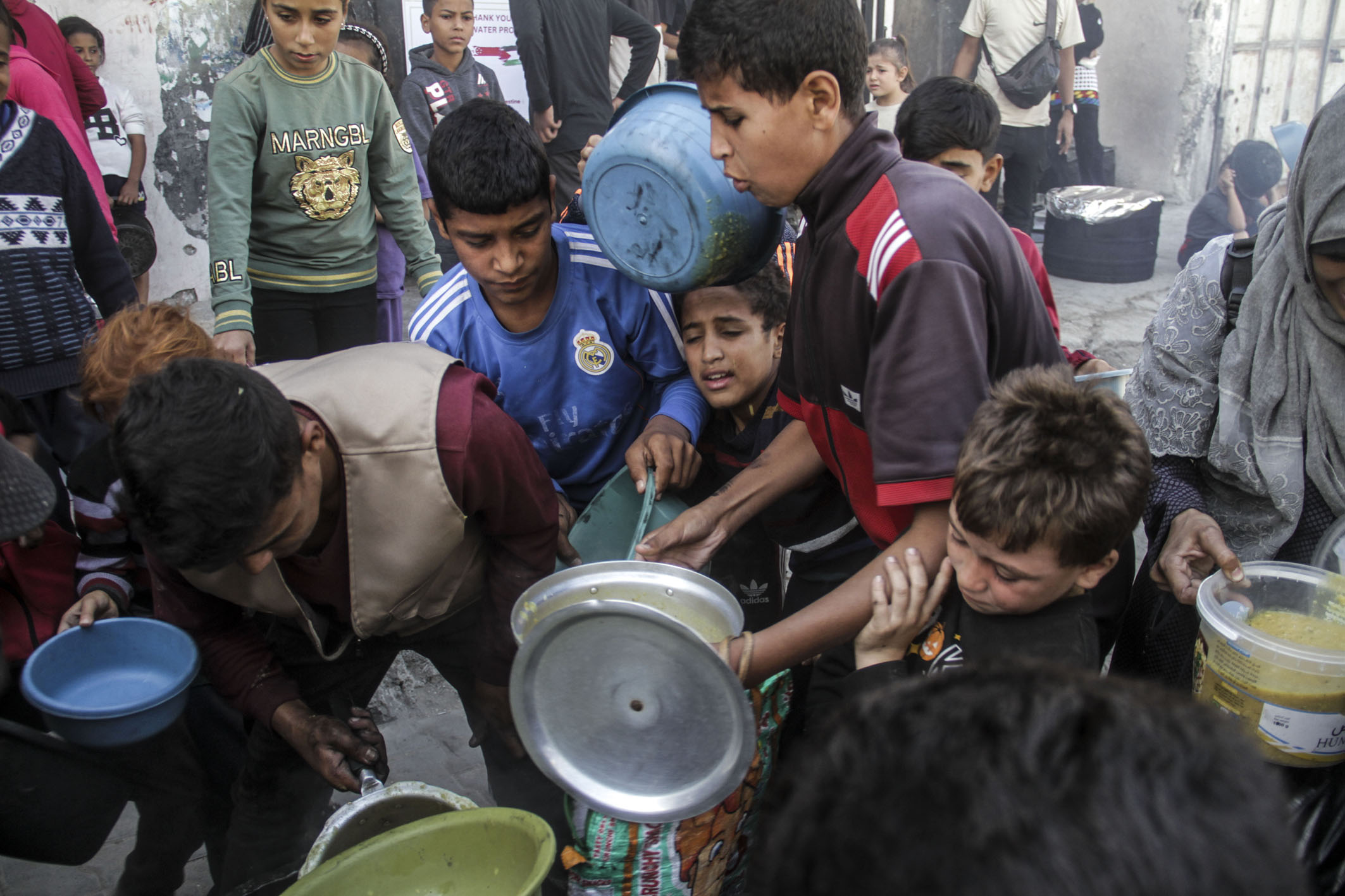 10月23日,人们在加沙地带北部的加沙城领取救济食品。联合国机构近日发布的报告显示,整个加沙地带面临饥荒风险,约86%人口处于“极度严重”饥饿状态。以色列军方持续猛烈攻击加沙地带,阻碍人道主义援助进入,引发国际社会对加沙地带人道主义灾难迅速恶化的担忧。