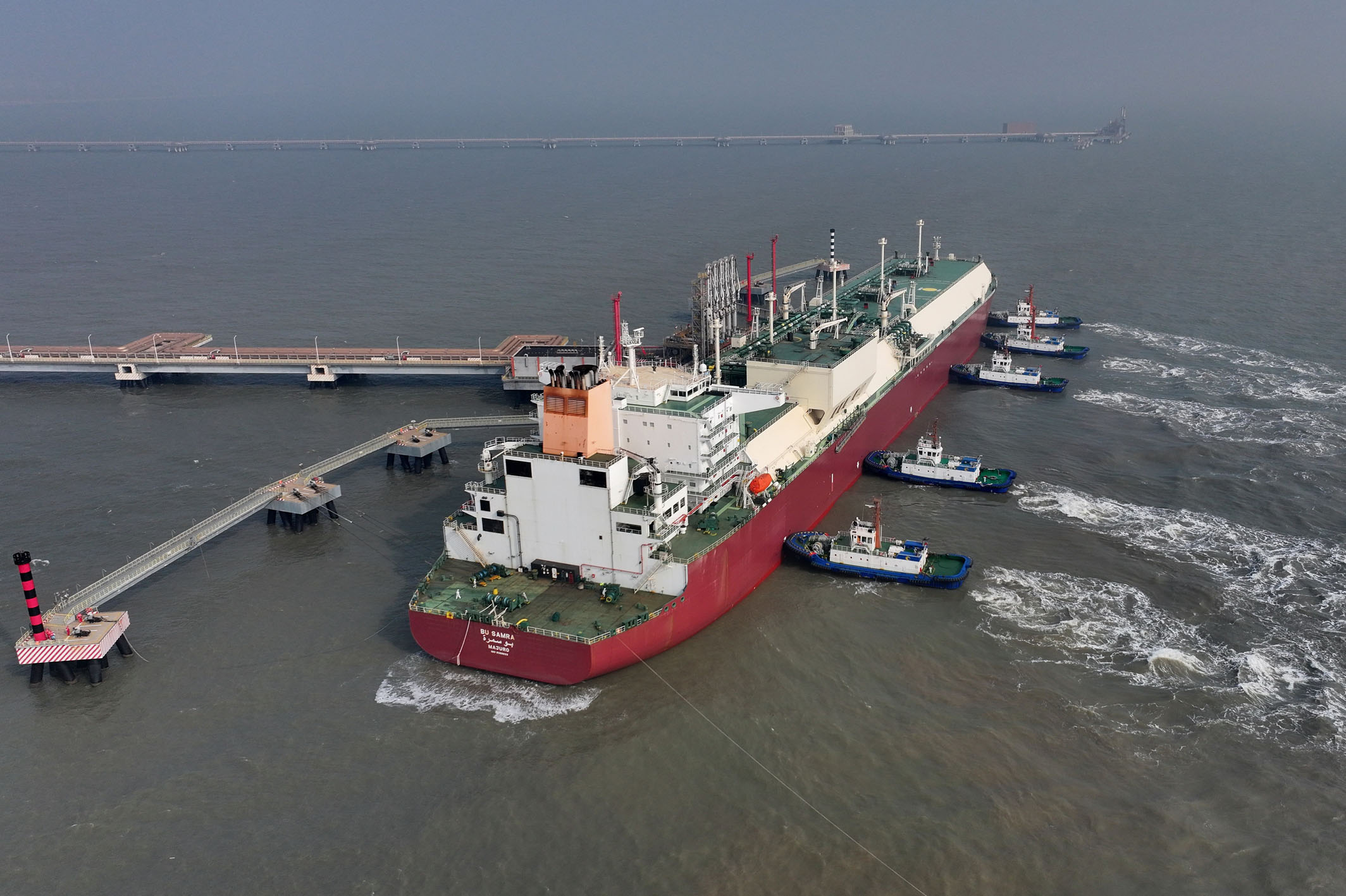 记者从河北省人民政府新闻办公室获悉,今年前三季度,河北省实现外贸进出口总值4624.3亿元人民币,同比增长12.9%。图为11月3日,一艘LNG船在拖轮的协助下向河北唐山港曹妃甸港区LNG码头靠泊。