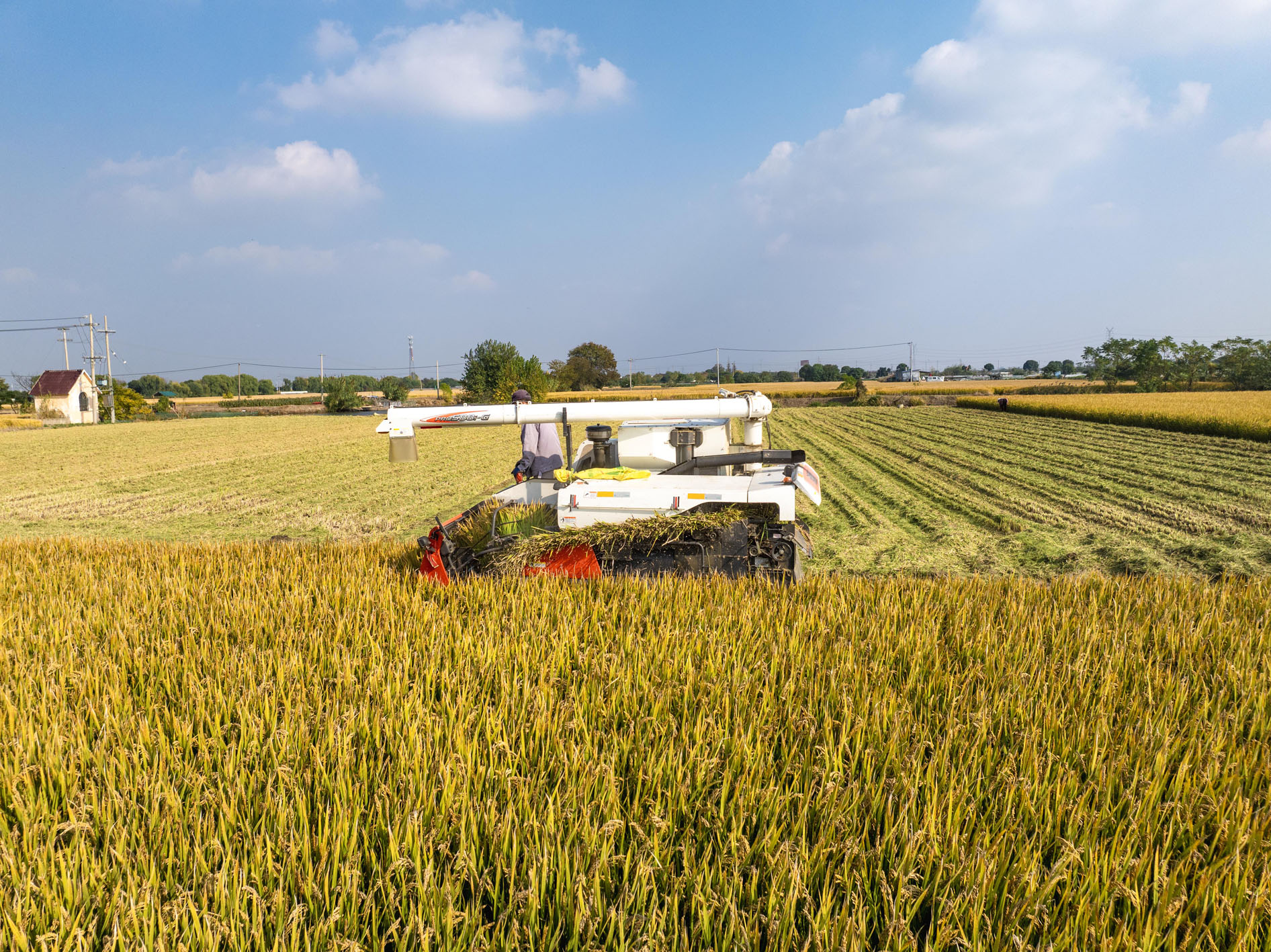 11月11日,农民驾驶农机在江苏省兴化市陈堡镇唐庄村田间收割晚稻(无人机照片)。初冬时节,我国部分地区的晚稻陆续成熟,田间地头一派繁忙收获景象。