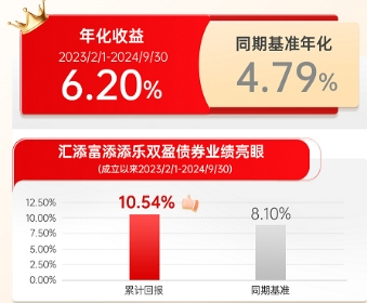 近1年业绩排名来源于银河证券基金研究中心,汇添富添添乐双盈A同类指普通债券型基金(二级),近一年排名 5/429,近一年指 2023/10/1-2024/9/30,具体排名规则详见银河证券官网。