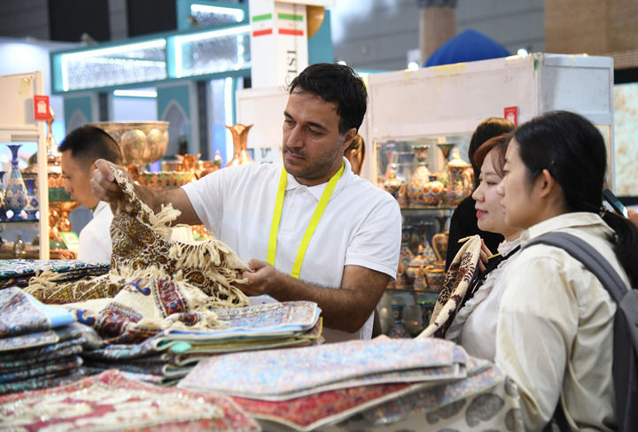 2024年9月20日,在陕西省西安市举行的第八届丝绸之路国际博览会上,来自伊朗的参展商(前左一)向观众介绍产品。 新华社记者 张博文 摄