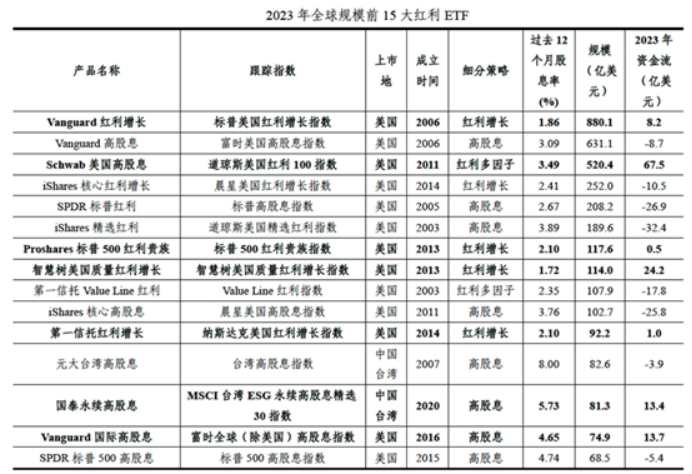 与投资者所理解的红利主要是高股息策略不同,全球红利策略还包括了红利成长策略,大约占1/3规模。红利成长策略所选取股票的股息率大约在1-3%,接受适中的市盈率,行业上是工业、消费、医疗、信息技术等典型的成长性行业。根据中证指数统计,2023年全球最大的红利ETF是Vanguard红利增长,规模880亿美元,采用的就是红利成长策略。
