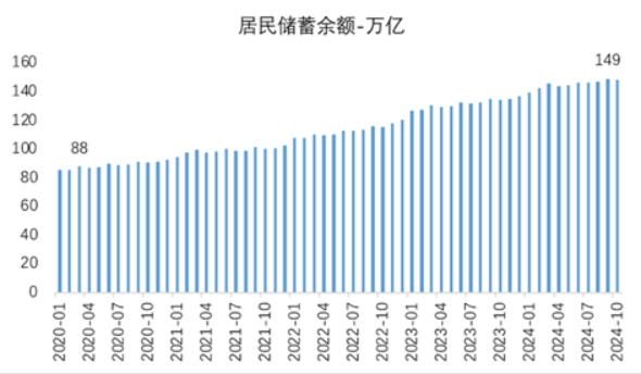 根据央行公布的数据,2024年9月居民储蓄存款余额已经达到了149万亿,而居民贷款余额82万亿,对应的居民净存款67万亿。作为对比,2020年3月居民储蓄存款余额88万亿,居民贷款余额57万亿,对应的居民净存款31万亿。可以看到,4年半年的时间里,居民净存款增加了一倍多,增加额有36万亿。