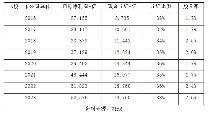 由于投资需求的减少,和现金逐渐的过剩,A股上市公司越来越多的选择现金分红回报股东。2016年整体A股市场的现金分红占利润的比例是32%,而2023年已经提升到38%;分红的总金额,也从2016年的不到9000亿,提升到了2023年的2万亿。由于分红金额的持续增加,A股市场总体股息率的中枢也是持续抬升的,在2023年底达到了2.6%的总体股息率。