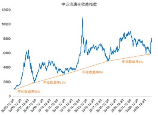 观察选择中证流通全收益指数观察市场回报率的情况,该指数在新股上市1年后才纳入,反应A股市场投资者的投资回报情况。从2005年底以来的4个指数大底部,来观察A股市场的年化收益率变化趋势,可以看到年化收益率是持续下降的。2018年底到2024年9月,两个大底部之间的年化收益率只有3%,可以看出由于市场悲观情绪导致过于低估。即使不考虑最近一段过于悲观的收益率,随着经济增速的换挡,展望未来A股市场整体回报率预期或不会像过去那么高。