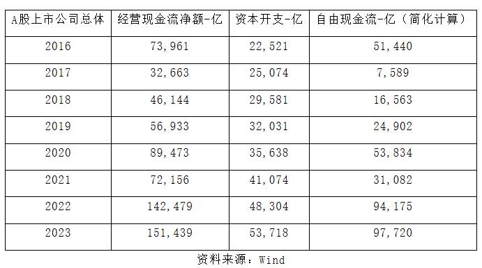 从A股所有上市公司加总的数据来看,2016年到2023年,经营现金流净额从7万亿增加到15万亿,资本开支从2万亿增加到5万亿,简化计算的企业可自由支配的自由现金流从5万亿增加到10万亿。这个变化的过程,正是高质量发展的写照。