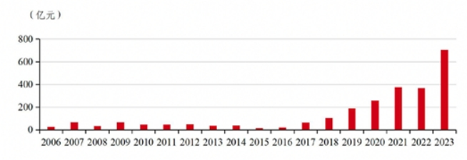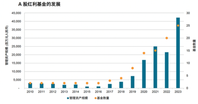 根据中证指数统计,2023年境内红利指数型产品数量达60只,产品规模突破700亿元人民币,跟美国超过4200亿美元的红利指数型产品相比,规模相差了40多倍。根据标普公司统计,2023年国内红利基金(含主动权益)共25只,规模刚超过400亿元,发展空间可期。