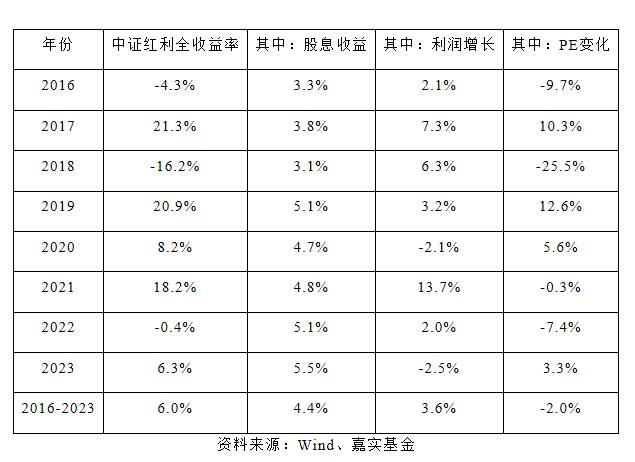如果对中证红利全收益指数的收益率进行拆分,2016年至2023年中证红利全收益年化收益率6.0%,其中股息收益贡献4.4%,利润增长贡献3.6%,估值负贡献2.0%,估值之所以比较贵,是因为之前红利资产的估值略高。可以看到中证红利主要的收益来源是股息率,股息率的收益贡献超过了利润增长。与之对比,2016-2023年万得偏股混合型基金指数年化收益率3%,中证红利全收益在此区间明显跑赢,并且跑赢的主要来源是股息率。未来随着经济增长中枢的放缓,股息率相比利润增长的优势会更强,红利策略有望更强的超额表现。