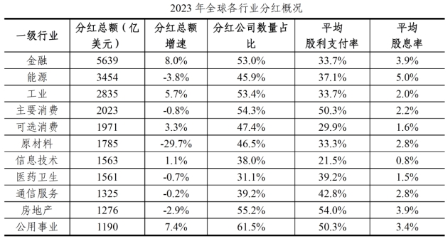 红利资产的分布是非常多元的。根据中证指数统计,全球分红金额体量靠前的行业主要是金融、能源、工业、主要消费、可选消费、原材料(资源)、信息技术、医疗卫生、通信服务(运营商)、房地产、公用事业。可以看到不仅包括了市场熟悉的金融、能源等传统行业,也包括了信息技术、医疗卫生这样的新兴成长行业。2023年全球信息技术上市公司分红金额1563亿美元,医疗卫生上市公司分红金额1561亿美元,都大幅超过了公用事业的1190亿美元,只是因为估值贵,平均股息率分别只有0.8%和1.5%。