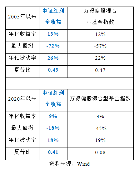 我们以中证红利指数作为红利投资的代表性指数,为求准确,所有指数都使用包含股息再投资的全收益指数版本。可以看到2005年以来,中证红利全收益指数跑赢了总体偏股基金过往平均表现。如果看2020年以来的近5年,中证红利全收益指数跑赢则更加明显,夏普比率也大幅领先。