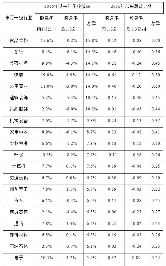 红利投资被普遍认为是一些传统高股息行业的投资,但事实上红利投资是一个在绝大部分行业都非常有效的策略。我们统计了30个申万一级行业2016年以来红利策略的有效性,将各个行业的上市公司按照股息率从高到低分3组,每年初按照股息率排序进行一次调仓。得到的结果是,有29个行业,高股息率组合比低股息率组合有更好的年化收益率,其中22个行业高股息率组合的年化收益率高出了5个百分点,这是非常强的;有28个行业,高股息率组合有更好夏普比。