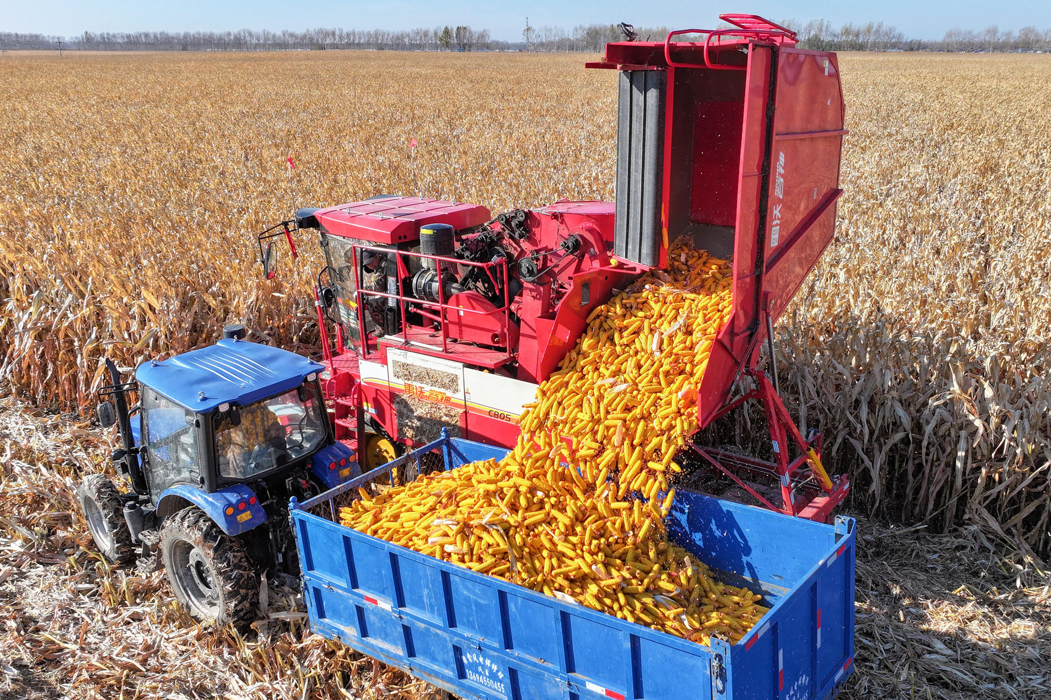 国家统计局最新公布数据显示,2024年,黑龙江省粮食总产量达到1600.34亿斤。图为在黑龙江省肇东市五里明镇东升村,农民驾驶农机收获玉米。