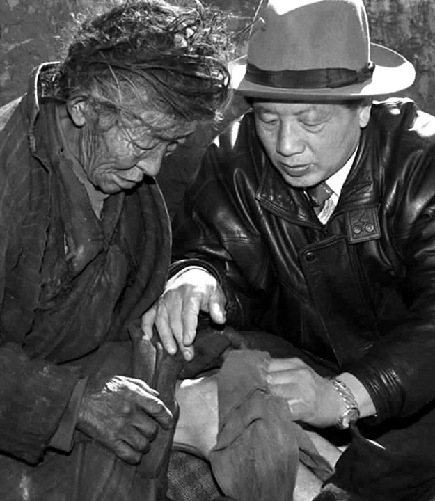 孔繁森(右)在西藏阿里日土县过巴乡看望孤寡老人益西卓玛(资料照片)。 新华社发