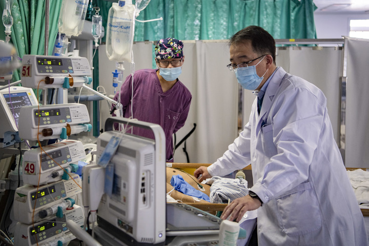 北京援藏医生王小亭(右)在西藏自治区人民医院病房为病人做重症超声评估(2020年2月23日摄)。 新华社记者 孙非 摄