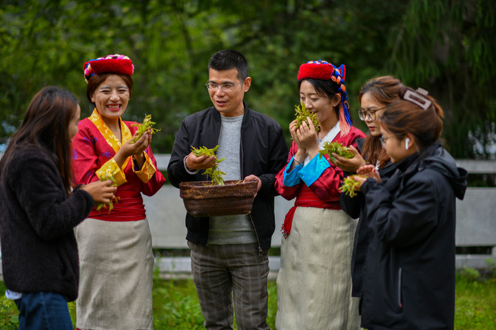 安徽省援藏干部王天柱(左三)为贡日门巴民族乡斯木村干部群众讲解莓茶采摘技术要求(2023年7月28日摄)。新华社记者 姜帆 摄