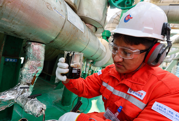 通过援藏央企中国海油招聘后的强巴,在秦皇岛32-6油田“渤海世纪号”(FPSO)16万吨级浮式生产储油装置上检查原油油样(2024年3月7日摄)。新华社记者 姜帆 摄