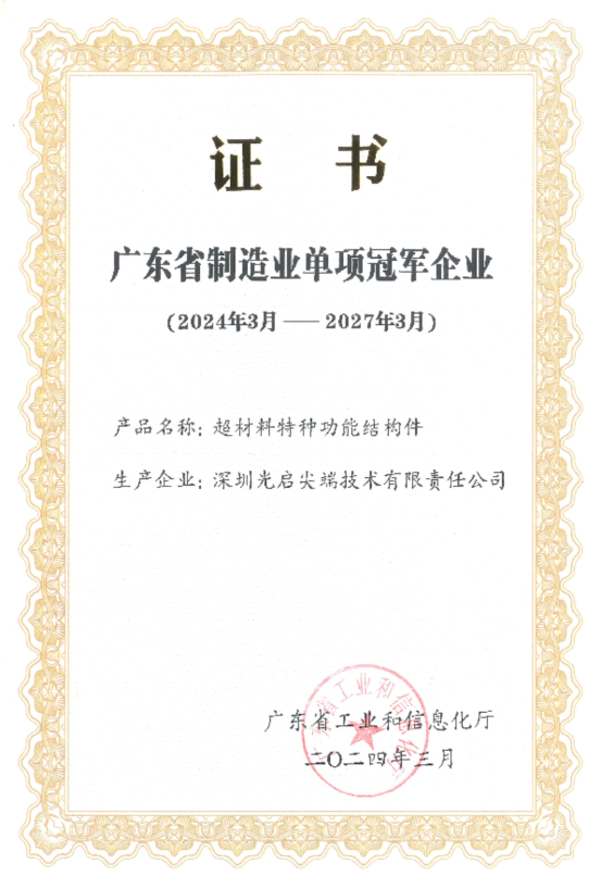 近日,广东省工业和信息化厅公布“2024年省级制造业单项冠军企业名单”,光启技术凭借“超材料特种功能结构件”产品,荣获“广东省制造业单项冠军企业”称号。