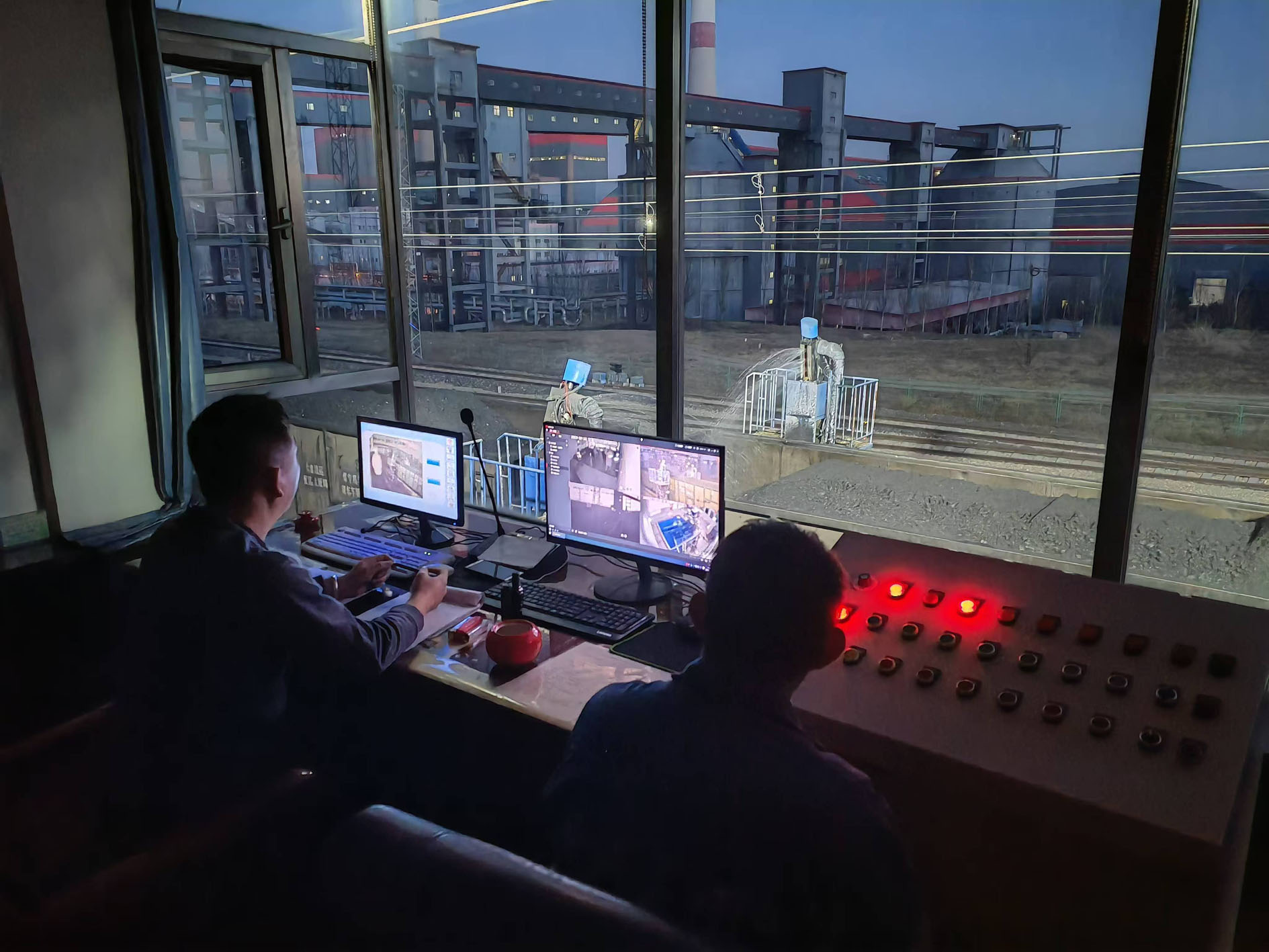 图为在塔山矿集运站,工作人员正在监控抑尘剂喷洒情况。 记者 许雄 摄