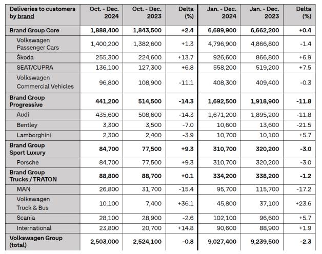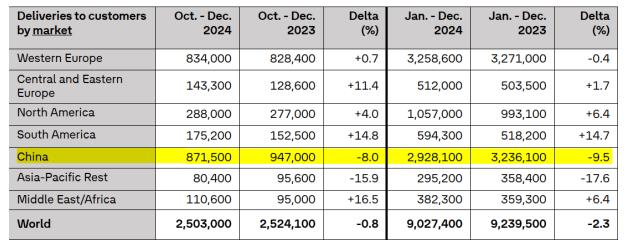 图:大众汽车集团2024年第四季度及全年分地区汽车销量情况 资料来源:公司官网