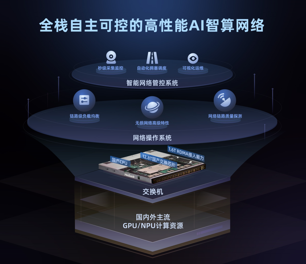 面对这一难题,微众银行另辟蹊径,深度拆解自身业务发展需求,面向AI智算场景,打造软硬件全栈自主可控的高性能AI智算网络解决方案,实现软硬件解耦与灵活组合配置。
