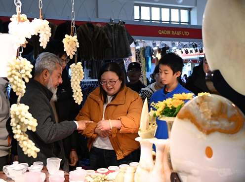 一家巴基斯坦参展商在昆明新春年货博览会上向中国参观者介绍玉石装饰品。(熊轩昂摄)