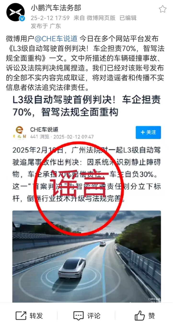 事情缘起微博用户“CHE车说道”于2月12日上午在多个平台发布的一则题为《L3级自动驾驶首例判决!车企担责70%,智驾法规全面重构》的文章。不过,2月12日17点59分,“小鹏法务部”微博号发布消息称,该文章中所描述的车辆碰撞事故、诉讼及法院判决纯属造谣。