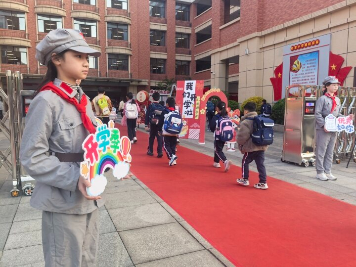 在廖承志红军小学门口,身穿红军装的值日生们精神抖擞,和校长老师们站在一起,迎接全校2500多名同学返校。值日生们手里举着写有“优秀如你”“开学季”等字样的小手牌,格外醒目。“老师早!”“校长妈妈好!”同学们一进校园,便兴奋地向校长、老师们问好。大门右侧设置的“前进鼓”也备受欢迎,不少同学上前敲响,寓意新学期勇往直前。五年级的蔡小贝同学告诉记者,一想到马上能见到老师和同学,心里就非常高兴,早上也特意提早来到学校。
